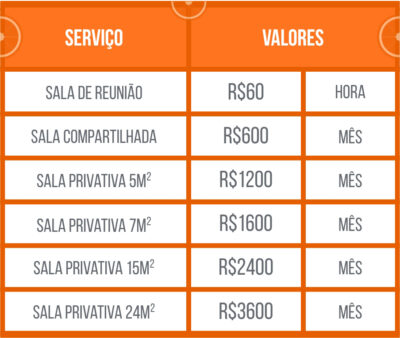 - preços de sala compartilhada, salas privativas e sala de reunião